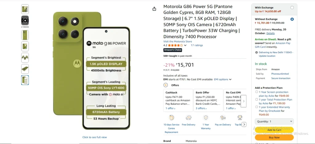 अमेजन ग्रेट इंडियन फेस्टिवल सेल में मोटरोला जी86 5जी स्मार्टफोन 21 फीसदी डिस्काउंट पर मिल रहा है।