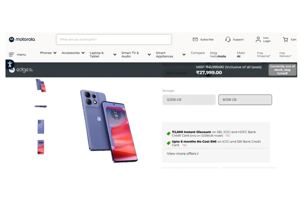 कंपनी की आधिकारिक वेबसाइट पर मोटोरोला मोटो एज 50 प्रो 5जी का दाम 41999 रुपये रखा गया है। हालांकि, छूट के बाद मोटोरोला मोटो एज 50 प्रो 5जी की कीमत 27999 रुपये रखी गई है। यह प्राइस 8GB रैम और 256GB की इंटरनल स्टोरेज वेरिएंट के लिए निर्धारित किया गया है।