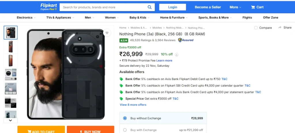 फ्लिपकार्ट सेल पर नथिंग फोन (3a) 10 फीसदी की छूट पर मिल रहा है। इस ऑफर के बाद ये 29999 रुपए की जगह 26999 रुपए में मिलेगा।