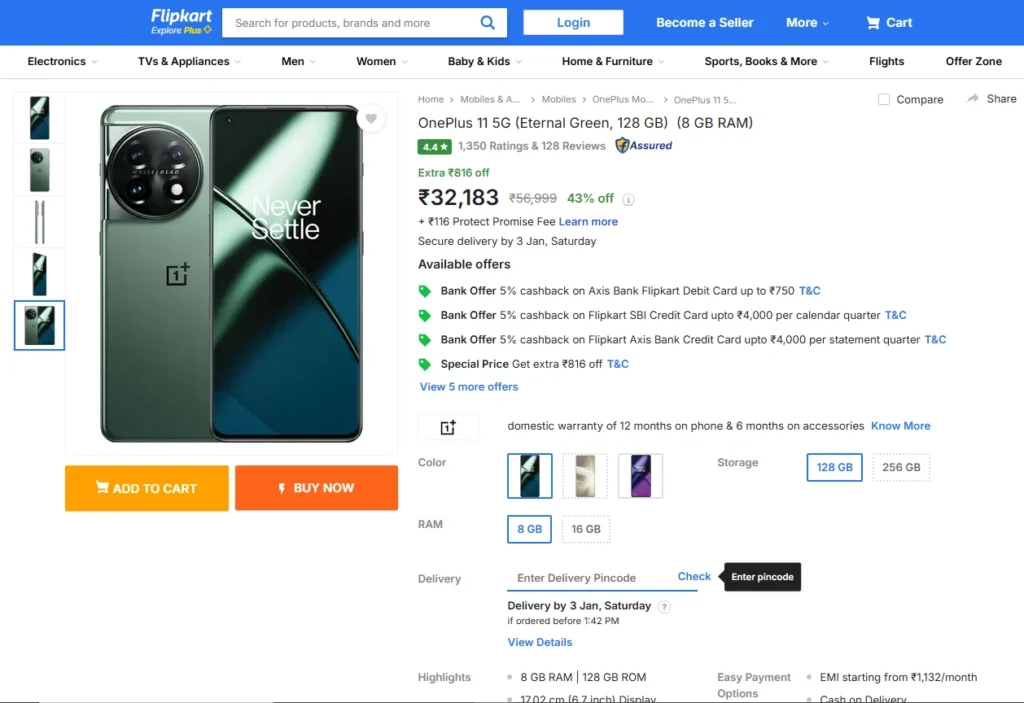 यहां पर ग्राहक के 24816 रुपए बचेंगे। फ्लिपकार्ट वनप्लस 11 पर एक्सिस और एसबीआई के कार्ड से पैमेंट करके 5 फीसदी की अन्य बचत कर सकते हैं।