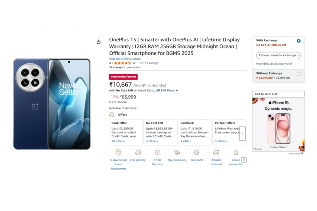 ऑनलाइन शॉपिंग कंपनी अमेजन के मुताबिक, वनप्लस 13 5जी फ्लैगशिप मोबाइल की एमआरपी 72999 रुपये रखी गई है। मगर डील के तहत इसे खरीदने के लिए 12 फीसदी की छूट मिल रही है। ऐसे में इस धाकड़ फोन का दाम गिरकर 63999 रुपये रह जाता है। इसके साथ कैशबैक, बैंक ऑफर्स और पार्टनर ऑफर्स का भी लाभ उठाया जा सकता है।