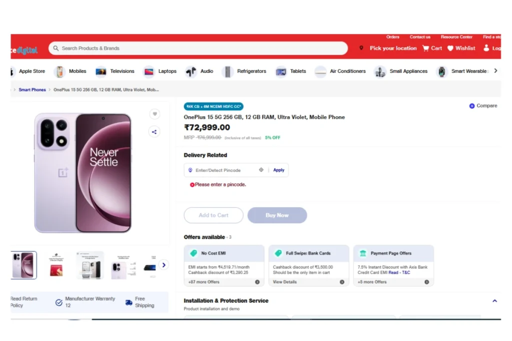 शुरुआत करते हैं अमेजन प्लेटफॉर्म से, अमेजन वेबसाइट पर वनप्लस 15 5जी फोन के 12GB रैम और 256GB स्टोरेज वाले वेरिएंट को 76999 रुपये की एमआरपी के साथ उतारा गया है। मगर डील के तहत इसे खरीदने के लिए 72999 रुपये का भुगतान करना होगा। शॉपिंग साइट इस पर 5 फीसदी की छूट प्रदान कर रही है। साथ ही कैशबैक, बैंक ऑफर्स और एक्सचेंज ऑफर का भी फायदा उठा सकते हैं। एक्सचेंज ऑफर के तहत इसे 60000 रुपये की बचत के साथ खरीद सकते हैं। मगर इसके लिए पहले आपको अपने एरिया का पिनकोड डालकर ऑफर की जांच करनी होगी। ऑफर उपलब्ध होने पर एक पुराना फोन जमा करना होगा।