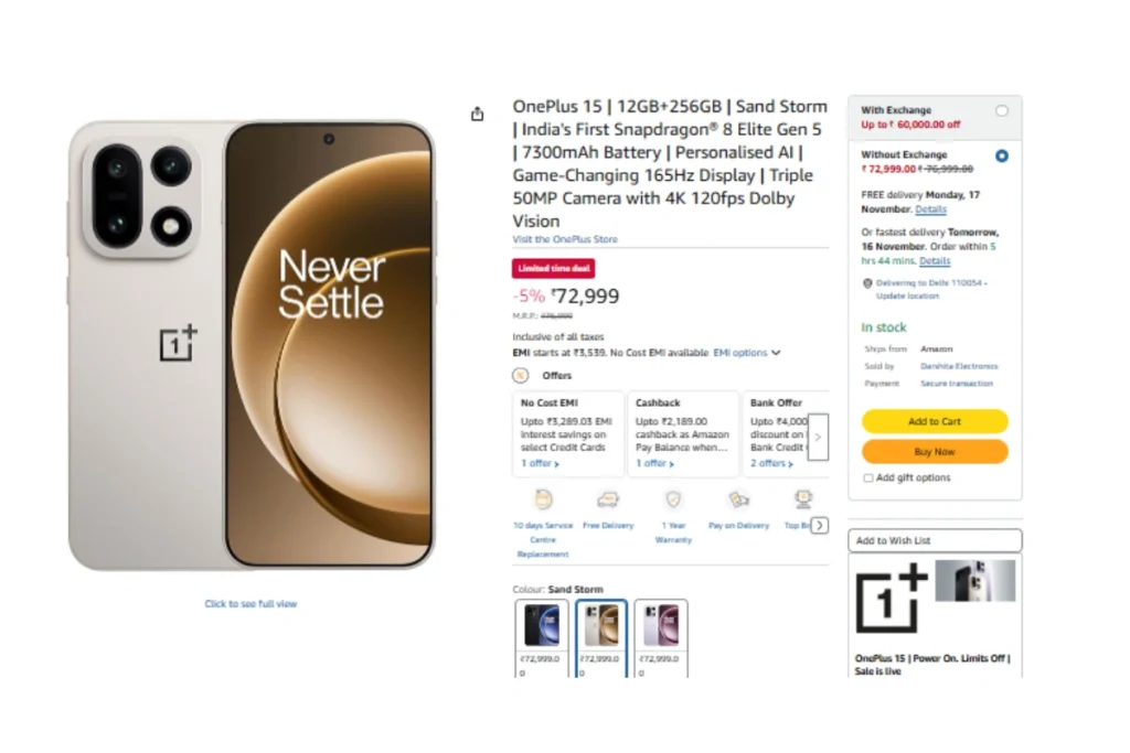 शुरुआत करते हैं अमेजन प्लेटफॉर्म से, अमेजन वेबसाइट पर वनप्लस 15 5जी फोन के 12GB रैम और 256GB स्टोरेज वाले वेरिएंट को 76999 रुपये की एमआरपी के साथ उतारा गया है। मगर डील के तहत इसे खरीदने के लिए 72999 रुपये का भुगतान करना होगा। शॉपिंग साइट इस पर 5 फीसदी की छूट प्रदान कर रही है। साथ ही कैशबैक, बैंक ऑफर्स और एक्सचेंज ऑफर का भी फायदा उठा सकते हैं। एक्सचेंज ऑफर के तहत इसे 60000 रुपये की बचत के साथ खरीद सकते हैं। मगर इसके लिए पहले आपको अपने एरिया का पिनकोड डालकर ऑफर की जांच करनी होगी। ऑफर उपलब्ध होने पर एक पुराना फोन जमा करना होगा।