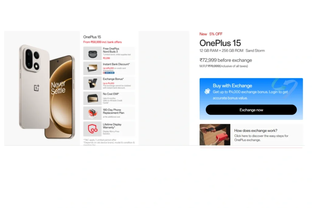 फोन मेकर ने अपने ऑफिशियल पेज पर बताया है कि वनप्लस 15 5जी को 76999 रुपये के साथ उतारा गया है। मगर इसे खरीदने के लिए 72999 रुपये का भुगतान करना होगा। हालांकि, कंपनी इस पर 4000 रुपये तक का इंस्टेंट डिस्काउंट दे रही है। साथ ही मुफ्त में वनप्लस नॉर्ड बड्स 3 दे रही है। इसके अलावा, इस पर 4000 रुपये तक का एक्सचेंज बोनस भी ले सकती है। मगर इसके लिए कंपनी की सभी शर्तों को पूरा करना होगा।