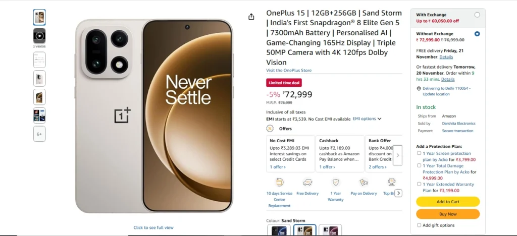 अमेजन पर वनप्लस 15 स्मार्टफोन 5 फीसदी की छूट पर मिल रहा है। इस ऑफर के बाद ये 76999 रुपए की जगह 72999 रुपए में मिलेगा।