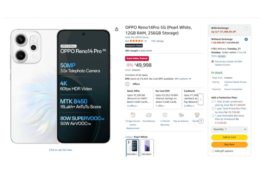 फेस्टिव सीजन के दौरान अमेजन पर ओप्पो रेनो 14 प्रो 5जी फोन को 9 फीसदी की छूट के साथ लिस्ट किया गया है। कंपनी ने इसका प्राइस 54999 रुपये रखा है। हालांकि, डील के तहत इसे 49998 रुपये में अपना बना सकते हैं। इस मोबाइल को 4.4 स्टार रेटिंग प्रदान की गई है।