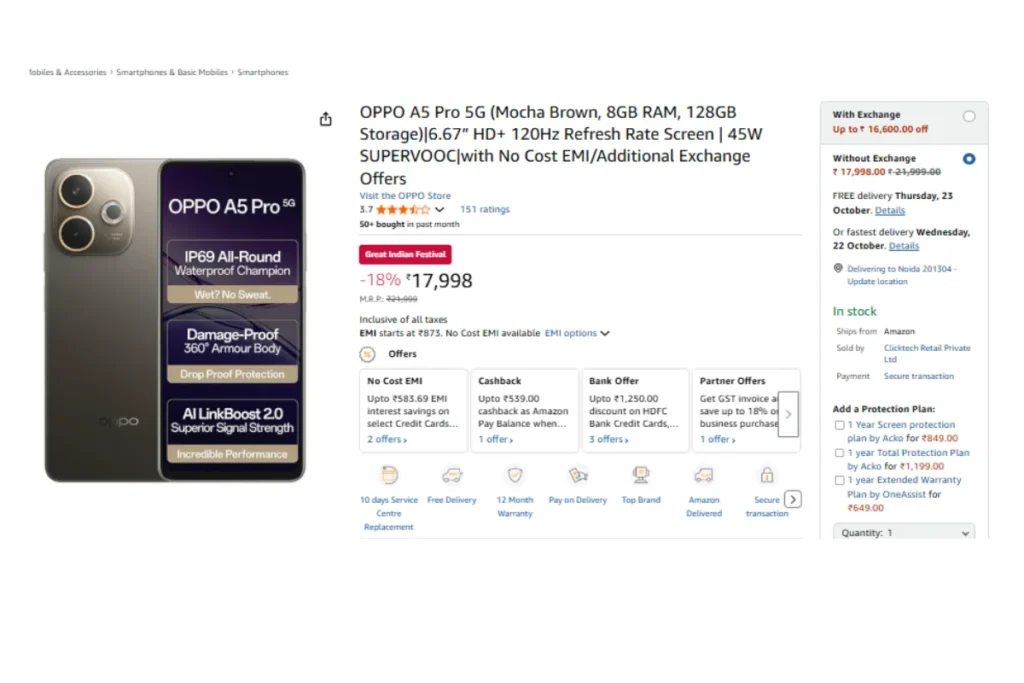 इस दिवाली के दौरान अमेजन साइट पर ओप्पो ए5 प्रो 5जी फोन को 18 फीसदी कम दाम पर उतारा गया है। इसका दाम 21999 रुपये शो किया जा रहा है। मगर ऑफर के तहत इसे 17998 रुपये में अपना बना सकते हैं। अभी तक इसे 3.7 स्टार दिए गए हैं।