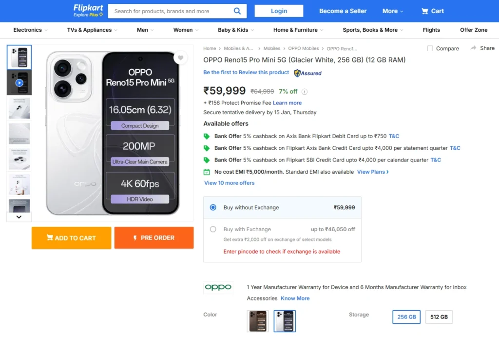 फ्लिपकार्ट सेल पर ओप्पो रेनो 15 प्रो मिनी स्मार्टफोन 7 फीसदी की छूट पर मिल रहा है। इस ऑफर के बाद ये 64999 रुपए की जगह 59999 रुपए में मिलेगा।