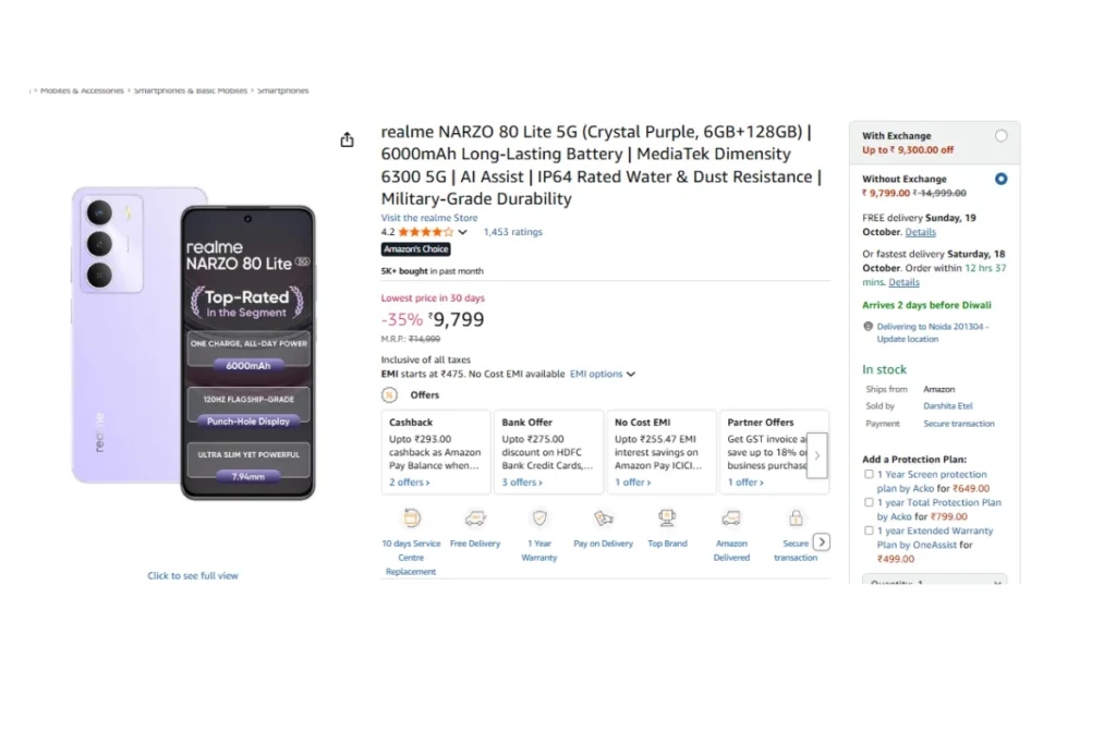 वहीं, रियलमी नार्जो 80 लाइट 5जी मोबाइल को अमेजन की सेल में 35 फीसदी कम प्राइस पर लिस्ट किया गया है। ऐसे में इसका दाम 14999 रुपये निर्धारित किया गया है। हालांकि, ग्राहकों को इसके लिए 9799 रुपये का भुगतान करना होगा। साइट पर इस फोन को भी 4.2 स्टार रेटिंग प्राप्त हुई है।