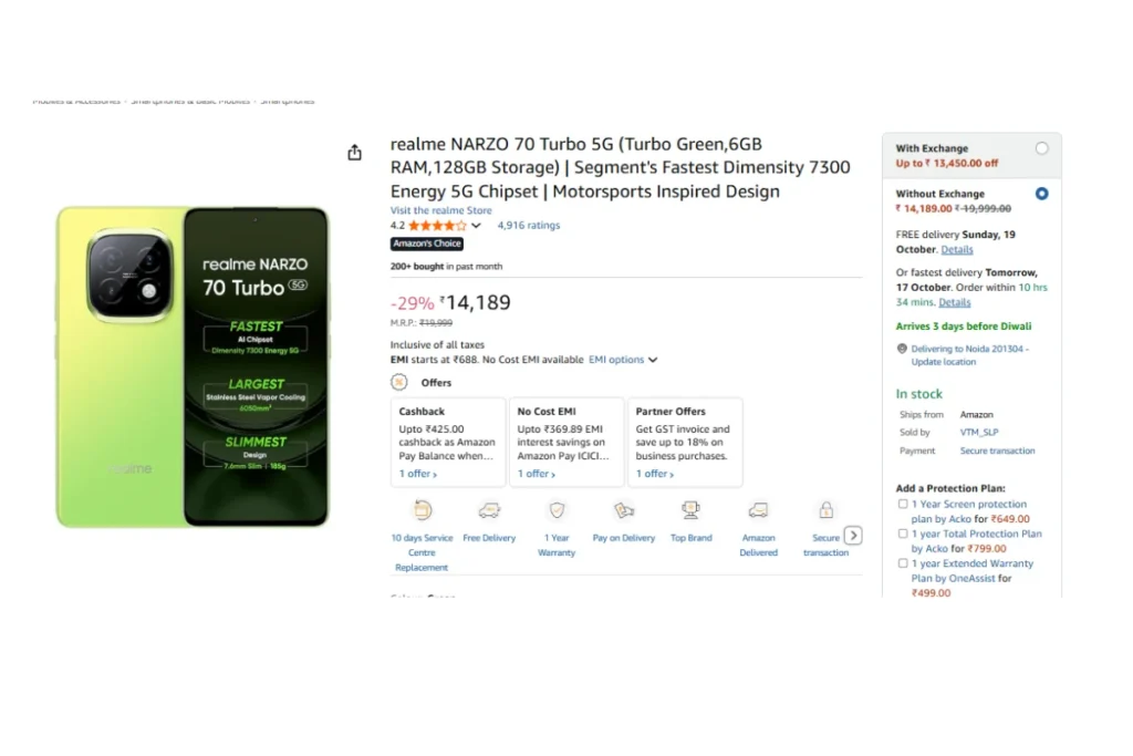 ऑनलाइन सेल में रियलमी नार्जो 70 टर्बो 5जी को अमेजन साइट से 29 फीसदी की छूट के साथ ऑर्डर कर सकते हैं। इस मोबाइल का प्राइस 19999 रुपये तय किया गया है। मगर यूजर्स को इसे खरीदने के लिए 14189 रुपये का भुगतान करना होगा। अभी तक इस फोन को 4.2 स्टार रेटिंग हासिल हुई है।