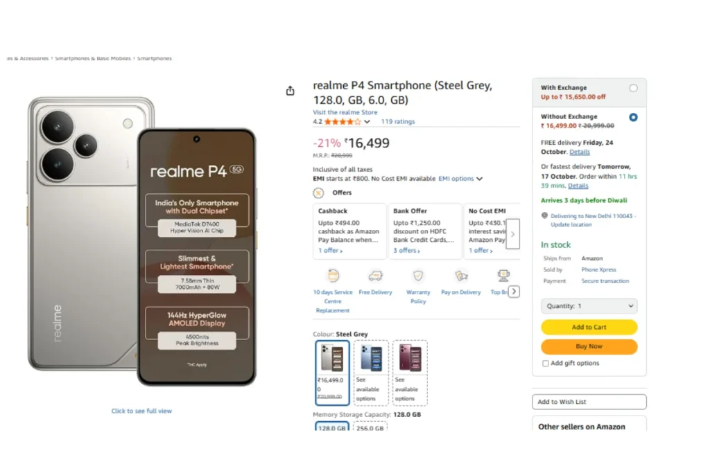 इस फेस्टिव सीजन में रियलमी दिवाली ऑफर्स के तहत अमेजन पर रियलमी पी4 5जी फोन को 21 प्रतिशत कम दाम पर बिक्री के लिए उपलब्ध कराया गया है। वेबसाइट पर इसका प्राइस 20999 रुपये शो किया गया है। मगर 16499 रुपये में इस फोन को घर पर मंगवाया जा सकता है। यूजर्स ने इस मोबाइल को 4.2 स्टार रेटिंग प्रदान की है।