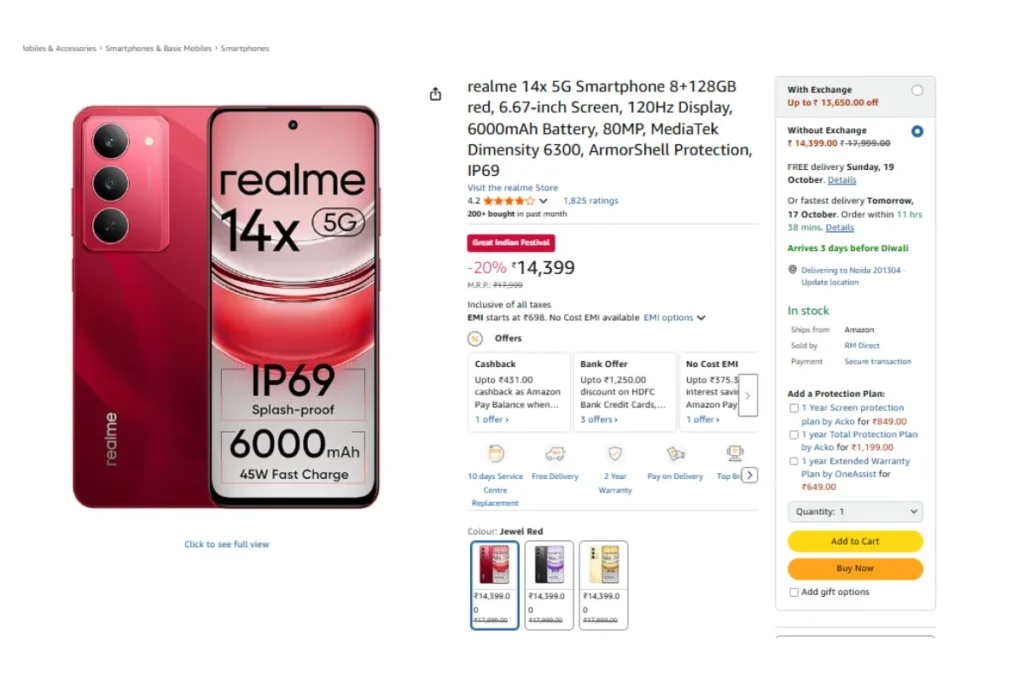 वहीं, अमेजन सेल में रियलमी दिवाली ऑफर्स के तहत रियलमी 14एक्स 5जी फोन पर 20 फीसदी का डिस्काउंट दिया जा रहा है। शॉपिंग साइट पर इसकी एमआरपी 17999 रुपये रखी गई है। हालांकि, ग्राहकों को इसे खरीदने के लिए 14399 रुपये का भुगतान करना होगा। इस फोन को भी 4.2 स्टार रेटिंग दी गई है।