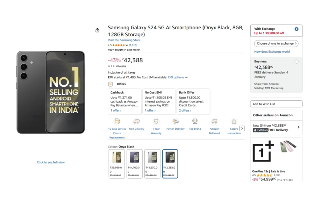 वहीं, इस फ्लैगशिप मोबाइल पर 39900 रुपये का एक्सचेंज ऑफर मिल रहा है। ऐसे में ग्राहकों को पहले अपने एरिया का पिनकोड डालकर ऑफर चेक करना होगा। अगर ऑफर उपलब्ध रहता है, तो एक सही कंडीशन का फोन अमेजन को जमा करना होगा।