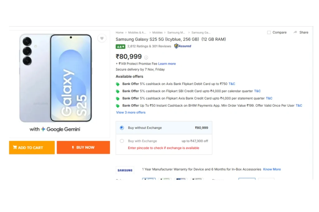 शॉपिंग वेबसाइट फ्लिपकार्ट पर सैमसंग गैलेक्सी एस25 5जी मोबाइल को 80999 रुपये के साथ उतारा गया है। इस पर फिलहाल कोई डिस्काउंट ऑफर उपलब्ध नहीं है। मगर ग्राहक इसे कैशबैक, बैंक ऑफर्स और पार्टनर डील्स के साथ खरीद सकते हैं।ऐसे में इस प्रीमियम फोन को थोड़ी सी छूट के साथ अपना बनाया जा सकता है।
