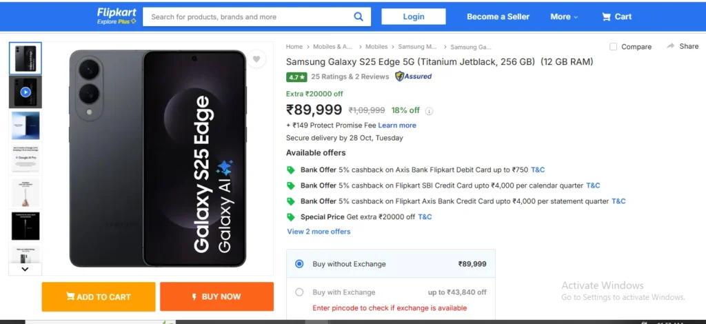Samsung Galaxy S25 Edge 5G स्मार्टफोन की कीमत और फ्लिपकार्ट सेल ऑफर