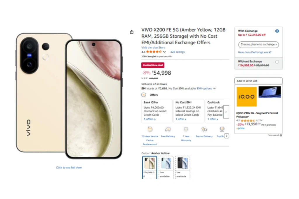 ऑनलाइन शॉपिंग वेबसाइट अमेजन के मुताबिक, वीवो एक्स200 एफई 5जी मोबाइल को 8 फीसदी की छूट के साथ लिस्ट किया गया है। फोन का असली दाम 59999 रुपये तय किया गया है। मगर डिस्काउंट के साथ इसे 54998 रुपये में खरीदा जा सकता है। हालांकि, ई-कॉमर्स कंपनी इस फोन पर कैशबैक, बैंक ऑफर्स और पार्टनर डील्स भी प्रोवाइड कर रही है। इन सबसे फोन का प्राइस काफी कम हो जाता है।