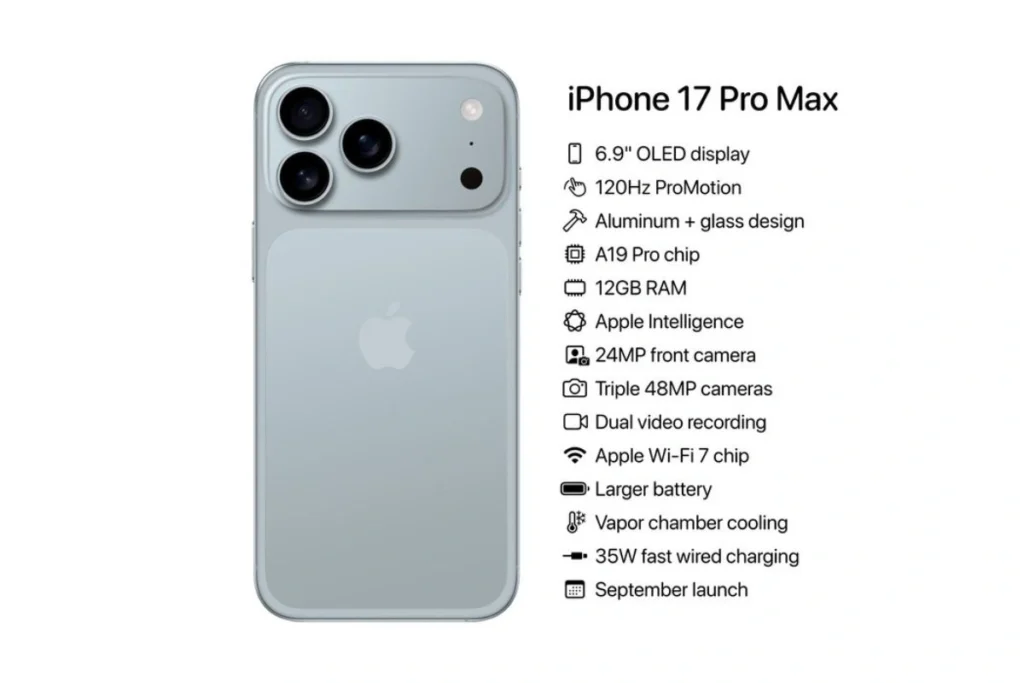 iPhone 17 Pro Max को कंपनी iPhone 17 Air नाम से उतार सकती है। क्योंकि Apple ने इसकी कोई जानकारी नहीं दी है। इसलिए अभी यही मॉडल लीक में चल रहा है।iPhone 17 Pro Max display में ProMotion Technology मिल सकती है। ये 6.9 इंच की हो सकती है। इसके साथ ही A19 processor मिल सकता है। इसमें iOS 26 का ऑपरेटिंग सिस्टम मिल सकता है। इसमें 24-megapixel का फ्रंट कैमरा मिल सकता है। इसके साथ ही 48-megapixel sensor मिल सकता है। कंपनी Ultra Wide lenses दे सकती है।