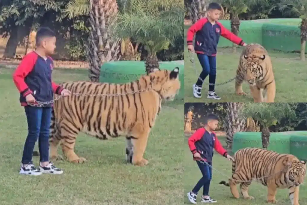 Animal Viral Video: सोशल मीडिया का अद्भुत दौर हमें समय-समय पर अजीबो-गरीब दुनिया से परिचित कराते रहता है। इस कड़ी में कुछ ऐसे वीडियो भी सामने आ जाते हैं जिसमे लोग जानवरों के साथ हैरअंगेज हरकत करते नजर आते हैं। इसमे कुत्ता, बिल्ली से लेकर अन्य कई तरह के पालतू जानवर शामिल हैं। हालाकि वर्तमान की बात करें तो सोशल मीडिया पर एक ऐसा वीडियो वायरल हो रहा है जिसमे एक छोटा बच्चा बाघ को जंजीर से बांधकर टहलाता नजर आ रहा है। ये सुनने में जितना अजीब लग रहा है, देखने में उतना ही भयावह है। असल में लोग जंजीरो में कुत्ता, बिल्ली या अन्य पालतू जानवर को लेकर ही घूमते हैं। ऐसे में बाघ को जंजीर में बांध कर घूमा रहे इस छोटे बच्चे को वीडियो (Video) सोशल मीडिया पर चर्चा का विषय बना हुआ है।
