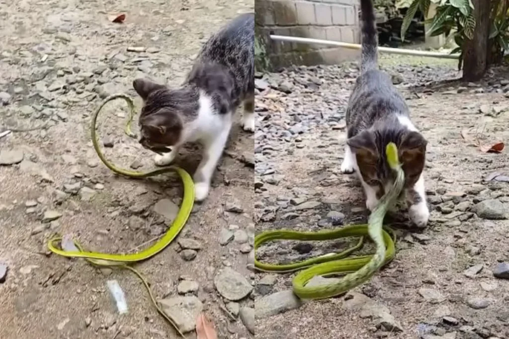 Animal Viral Video: सोशल मीडिया के अलग-अलग प्लेटफॉर्म पर बिल्ली और सांप के कई सारे Animal Viral Video चर्चा का विषय बने रहते हैं। इन्हें लोगों के द्वारा काफी पसंद किया जाता है। लेकिन आज का जो वीडियो हम आपके लिए लेकर आए हैं उसे देखने के बाद आपका सिर ना चकरा जाए तो कहना। इन दिनों एक वीडियो काफी चर्चा का विषय बना हुआ है। जिसमें देखा जा सकता है कि, एक हरे रंग के लंबे खतरनाक सांप से किस तरह से ये बिल्ली पंगा ले रहे है। पहले तो उसे वो अपने हाथों से थप्पड़ मारती है और फिर इसे अपने मुंह में दबाकर काटने लगती है।