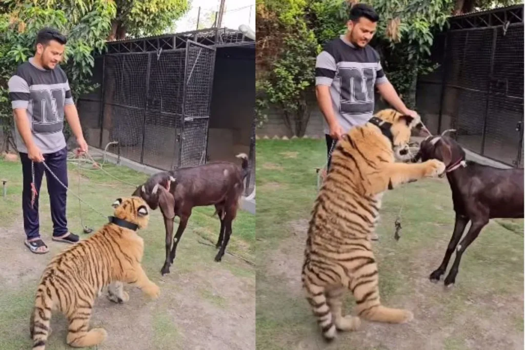 इंस्टाग्राम पर एक Animal Viral Video काफी तेजी से फैल रहा है। इस वीडियो में एक लड़के के हाथ में दो रस्सियां हैं, जिसमें एक से बाघ बंधा हुआ है तो, वहीं दूसरी रस्सी से बकरी बंधी हुई है। बाघ को अपने सामने देख बकरी को अचानक से गुस्सा आ जाता है और वो बाघ पर अपने सींग से हमला कर देती है। हमला होते ही ये बाघ काफी डर जाता है और जमीन पर बैठ जाता है, जबकि बकरी वहीं खड़ी रहती है। वीडियो में देख रहा बाघ का बच्चा अभी काफी छोटा है। जिसकी वजह से वो समझ नहीं पा रहा है कि, ये सब हो क्या रहा है?