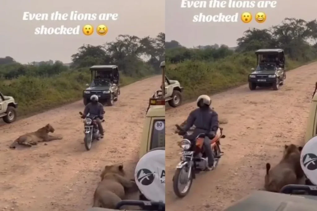ये हैरत में डाल देने वाला वायरल वीडियो Videokeffa_njoroge नाम के इंस्टाग्राम अकाउंट से 18 घंटे पहले ही शेयर किया गया है। ये वीडियो किसी जंगल का लग रहा है। जिसमें देखा जा सकता है कि, गाड़ियों और शेरों के बीच ये बाइक सवार बेखौफ होकर धीमी गति में बाइक निकाल रहा है। उसे जरा भी अंदाजा नहीं है कि, शेर उस पर कभी भी हमला बोल सकते हैं और उसकी जान ले सकते हैं। हैरानी की बात ये भी है कि इन दोनों के आस-पास कुछ लोग भी मौजूद हैं। लेकिन ये दोनों शेर शांत बैठे हैं। अचानक से हेलमेट लगाकर आए इस लड़के की हिम्मत को देख हर कोई हैरान है।