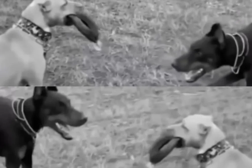 कुछ सेकंड को देखने के बाद आपको ऐसा लगेगा जैसे डाबरमैन से डर कर सामने वाला पिटबुल वहां से फरार हो जाएगा लेकिन पलक झपकते पिटबुल का अग्रेशन सामने आया और वह कुछ इस तरह अटैक मोड में दिखा कि डाबरमैन भाग खड़ा हुआ। इस वीडियो में पिटबुल हीरो बन गया क्योंकि उससे डर कर भौंकने वाला डाबरमैन नौ दो ग्यारह हो जाता है।