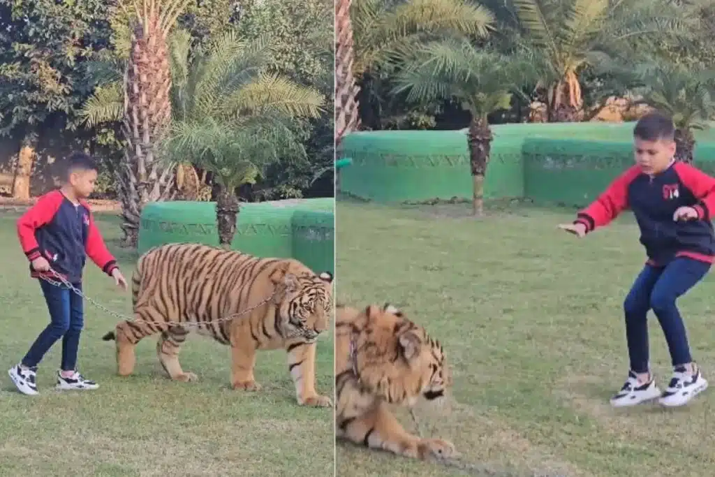 कुत्ते की तरह बाघ को चेन से खींचता दिखा बच्चा