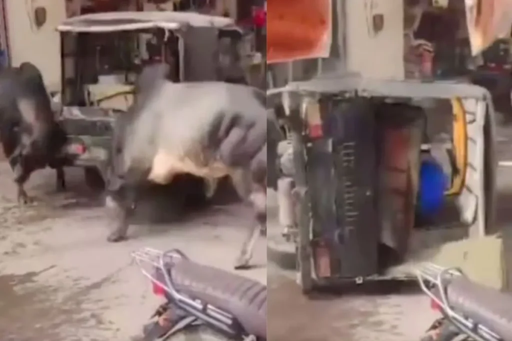 इस बीच एक ऑटो ड्राइवर इन सांडों की लड़ाई के बीच में आ जाता है वो अपना ऑटो लेकर सीधे इन सांडों की लड़ाई में घुस जाता है। जिसके बाद इनमें से एक सांड को खतरनाक गुस्सा आ जाता है वो अपने सींग से पूरे ऑटो को ही पलट देता है। इस दौरान दोनों सांड वहां से चले जाते हैं और अपने पलटे हुए रिक्शे के साथ ये ऑटो वाला वहीं रह जाता है।