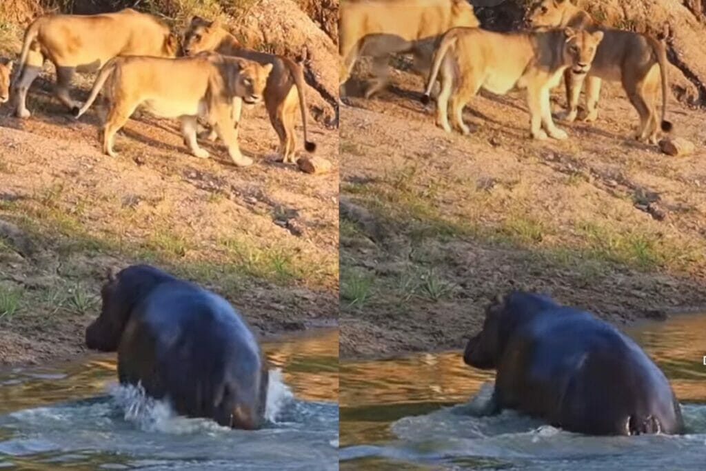 एक अकेले हिप्पो को देखकर दुम दबाकर भागे ख़तरनाक शेर