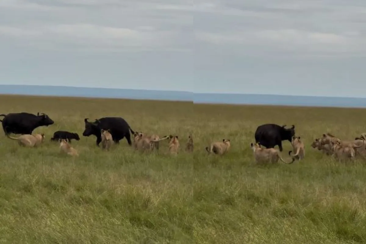 शेरों के पूरे कुनबे से भिड़े दो भैंसे