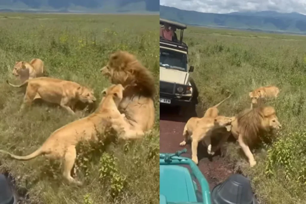 वायरल वीडियो में आप देख सकते हैं कि शेर और शेरनियों का एक समूह दिखाई दे रहा है। वहीं इसके साथ कैप्शन में लिखा है, “न्गोरोंगोरो क्रिएटर के प्रमुख नर शेरों और उनकी शेरनियों के बीच पारिवारिक मुद्दे जो आक्रामक रूप से उन्हें दूर धकेल देते हैं। वे अत्यंत भयंकर हैं।” वहीं वीडियो में आप देखेंगे कि कैसे एक शेर के पीछे कई शेरनियां भाग रही हैं वही दो शेर अलग दिशा में भागते हुए नजर आ रहे हैं वीडियो में आप देख सकते हैं एक सेब शेर ऊपर सब शेरनियां नजर आ रही है और कैप्शन से यह साफ जाहिर है कि यह उनका पारिवारिक क्लेश है।