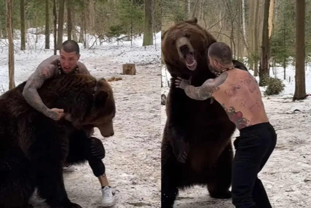 इस वीडियो में आप देखेंगे कि एक शख्स काले मोटे भालू के ऊपर चढ़ा हुआ नजर आ रहा है। भालू के साथ उसकी सवारी देखने के बाद यूजर्स की बोलती बंद हो जाती है। आपकी आंखें फटी की फटी रह जाएगी जब आप यह कि की भालू से उतरने के बाद शख्स उस खूंखार जानवर के साथ भिड़ जाता है। इसे देख आपके पैरों तले जमीन खिसक जाएगी। इस तरह के वीडियो सोशल मीडिया पर अक्सर वायरल होते रहते हैं और देखने के बाद लोगों की रूप कांप जाती है। इस वीडियो को देख ऐसा लग रहा है यह भारत का नहीं है।