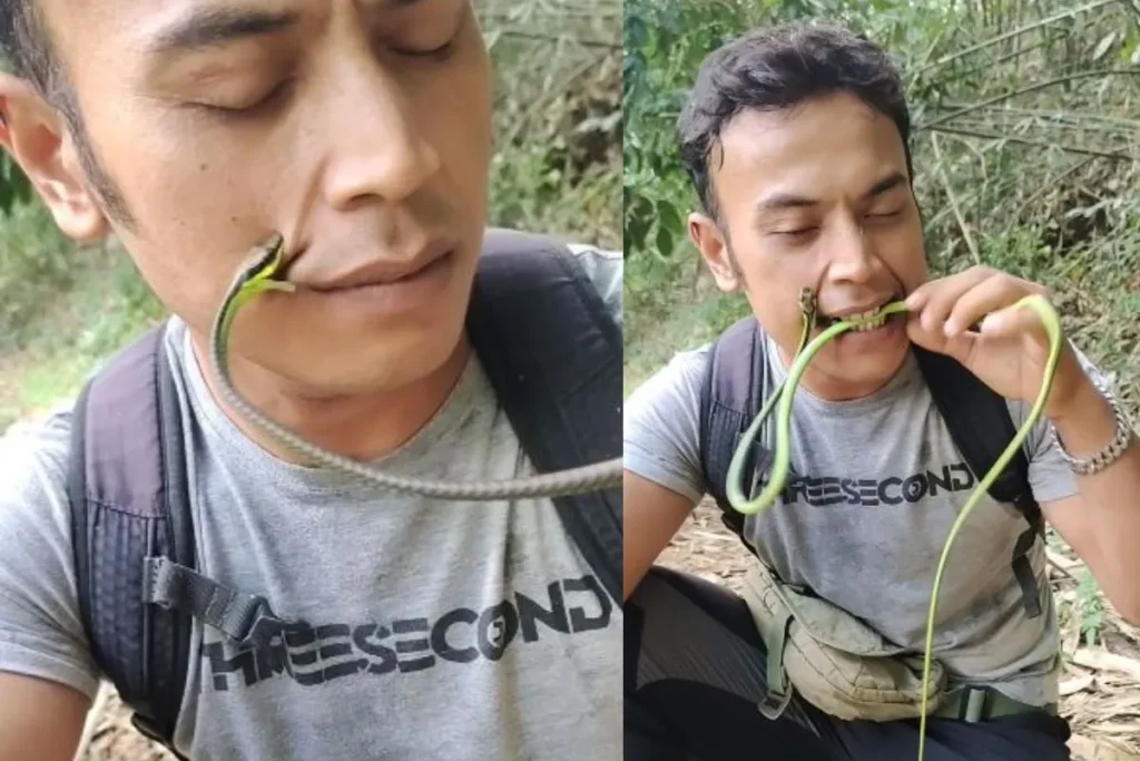 इस हैरतअंगेज वीडियो को jejaksiaden नाम के इंस्टाग्राम अकाउंट से शेयर किया गया है। इस वीडियो में देखा जा सकता है कि एक लड़का किसी जंगल में बैठा है और उसके हाथ में एक पतला सा सांप है जो कि, लहरा रहा है। इस सांप से ये लड़का बिना डरे खेल रहा है। वो सांप को सबसे पहले अपने होठों से दबाता है। इसके बाद ये सांप लड़के के गाल को अपने अपने मुंह से दबा देता है। सांप का मुंह काफी छोटा है लेकिन वो इस लड़के पर हमला कर रहा है। फिर अचानक से लड़का सांप को अपने दांतों से काटना शुरु कर देता है।