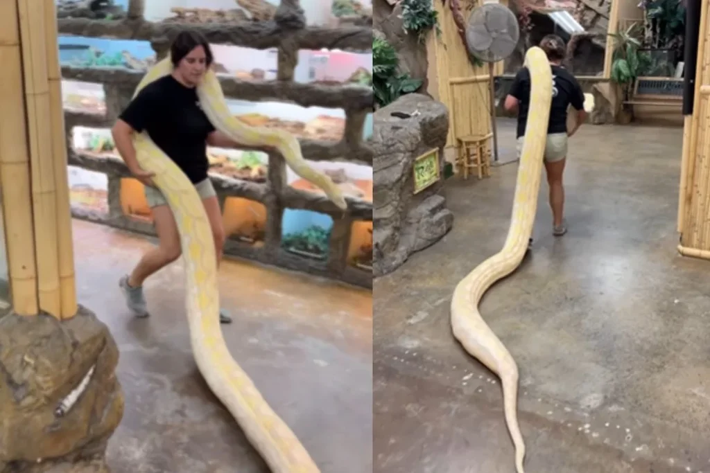 इस वीडियो को शेयर करते हुए कैप्शन में लिखा गया, “विशाल अजगर स्थानांतरण इन बड़े जालीदार अजगरों को संभालना मजेदार और खेल हो सकता है हमेशा नहीं। लेकिन जब पिंजरे की सफाई आदि के लिए उन्हें ले जाने की बात आती है तो यह निश्चित रूप से किसी कसरत से कम नहीं है। हालांकि मैं शिकायत नहीं कर रहा हूं निश्चित रूप से यह जिम की सदस्यता रद्द करने का एक बहाना है।” वीडियो के साथ ही महिला ने बता दिया है कि कैसे एक अजगर को संभालना बड़ी बात है।