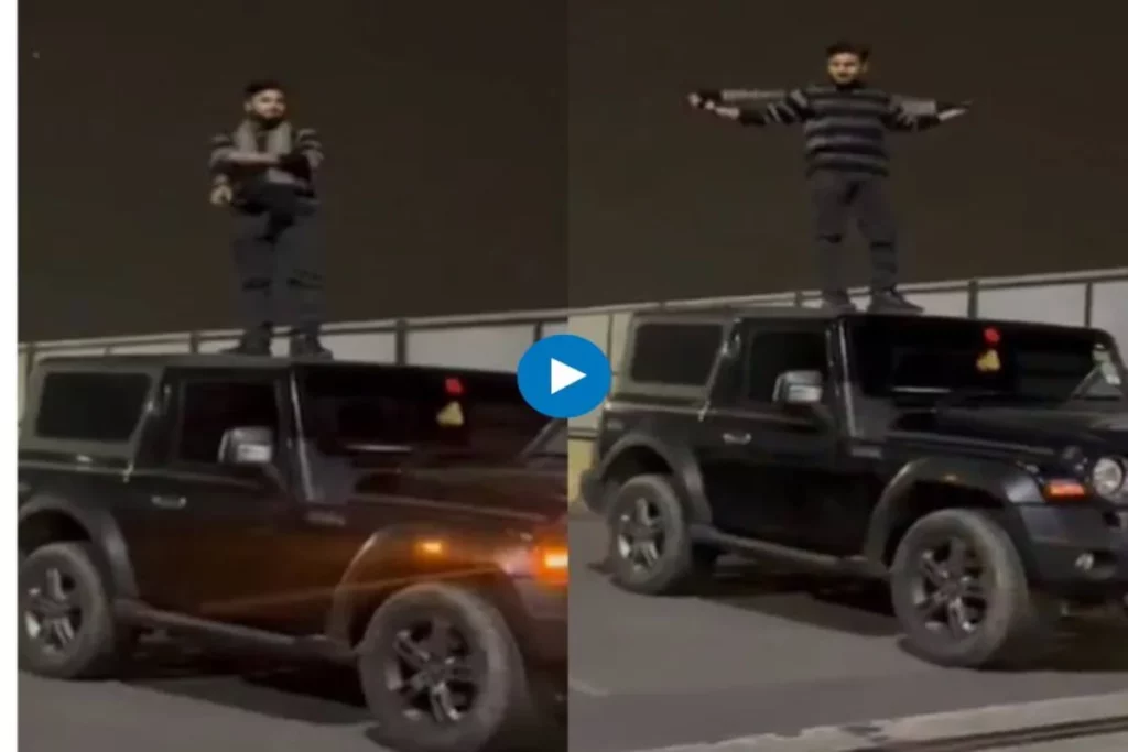 इस वायरल वीडियो में लड़का यार के ऊपर खड़े होकर स्टंटबाजी करता है और दूसरा लड़का उसका वीडियो बनाता है जो सोशल मीडिया पर वायरल है। योगेश दीक्षित ने अपने ट्विटर अकाउंट पर वीडियो शेयर किया है और इस वीडियो को लखनऊ का बताया है। इस वीडियो में देखा जा सकता है कि एक लड़का सड़क किनारे थार के ऊपर खड़े होकर स्टंट बाजी करता है। इस तरह कार के ऊपर स्टंट बाजी करने से लड़के को चोट भी लग सकती हैं। इस तरह की वायरल वीडियो पर पुलिस एक्शन भी ले रही है।