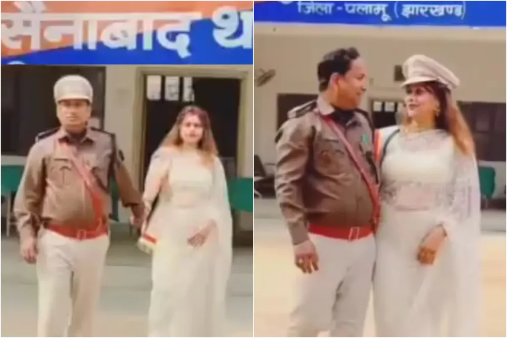 ओसीन जैन नामक एक्स हैंडल यूजर ने पलामू वायरल वीडियो पोस्ट किया है। वायरल वीडियो का संदर्भ हुसैनाबाद थाना में तैनात पुलिसकर्मी सोनू कुमार चौधरी से जुड़ा है। जानकारी के मुताबिक गणतंत्र दिवस पर सोनू कुमार की पत्नी भी थाने पहुंची जहां उन्होंने अपने पुलिसकर्मी पति संग रील बनाई। इस दौरान दोनों डांस करते नजर आए। लाइन हाजिर हुए पुलिसकर्मी ने अपनी टोपी निकाल कर पत्नी को पहना दी। देखते ही देखते रील बनाने से जुड़ा वायरल वीडियो सोशल मीडिया पर सुर्खियां बटोरने लगा और आरोपी पुलिसकर्मी पर गाज गिर गई।