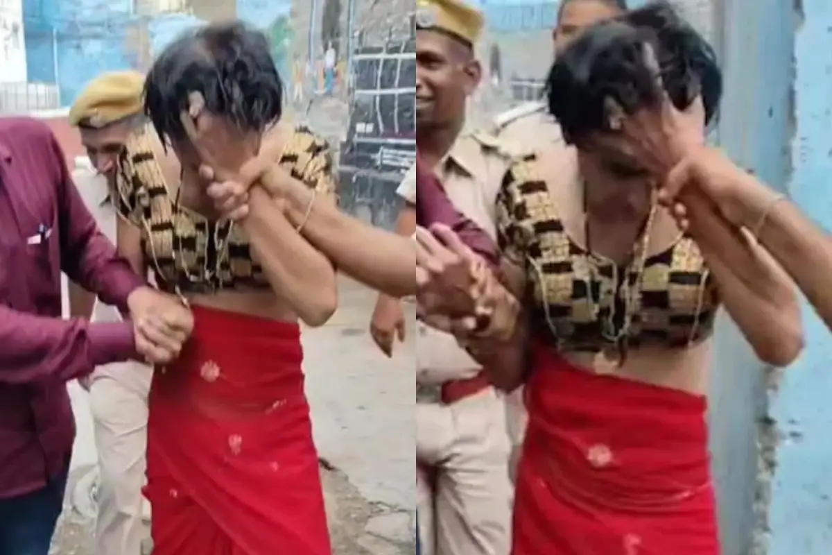 Picture Credit: सोशल मीडिया (साड़ी-ब्लाउज पहने पुलिस की गिरफ्त में हिस्ट्रीशीटर)