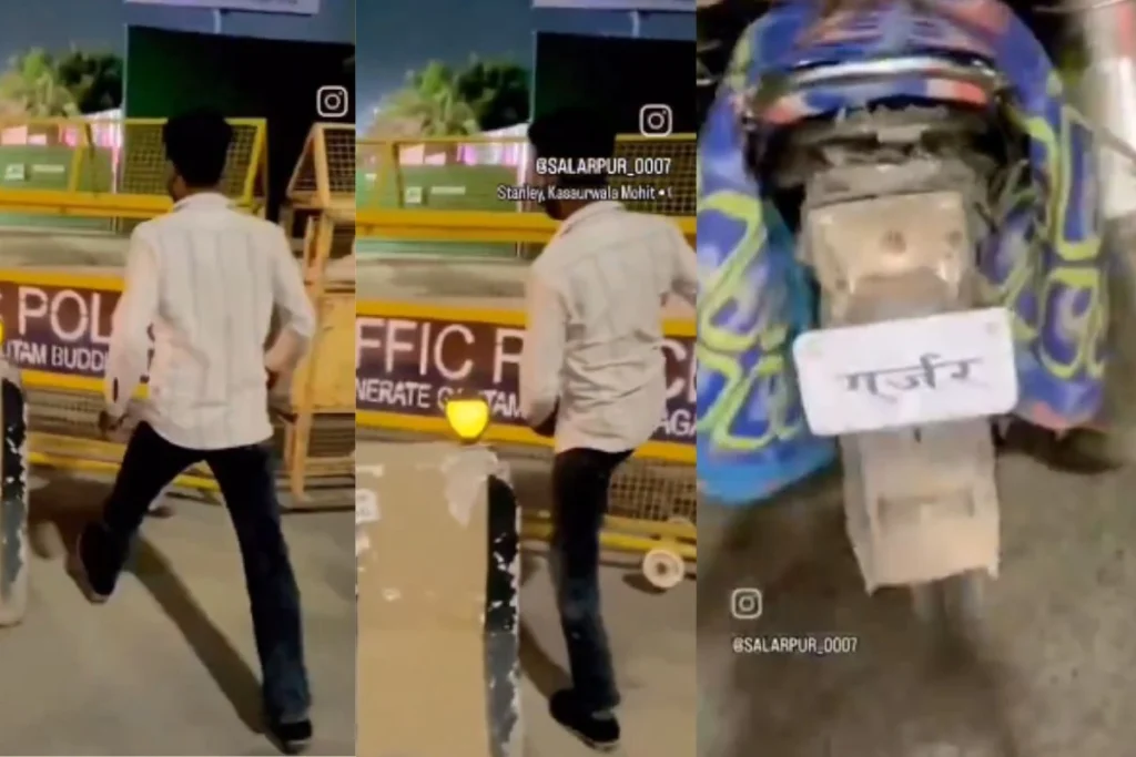 इसके साथ ही कैप्शन में जानकारी देते हुए लिखा है कि, “नोएडा पुलिस की बैरिकेडिंग पर लात मारना पड़ा महंगा, पुलिस ने काट दिया 40 हजार 5 सौ का चालान, नंबर प्लेट पर लिखा था गुर्जर।” वीडियो कुछ सेकंड है लेकिन काफी हैरान करने वाला है। वीडियो में देखा जा सकता है कि, एक लड़का बाइक से उतरता है और पुलिस बैरिकेडिंग पर लाते बरसाना शुरु कर देता है। वो सरकारी संपत्ति को नुकसान पहुंचा रहा है। हैरानी की बात ये है जब वो ये अजीब हरकत कर रहा होता है तो कोई उसकी वीडियो पीछे से रिकॉर्ड भी कर रहा होता है। इस वीडियो पर पुलिस ने एक्शन ले लिया है।