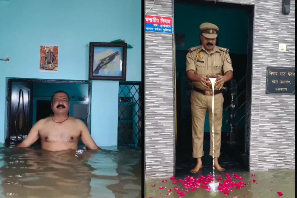 घर में कमर तक पानी भरते ही दरोगा जी ने पूजा कर लगा दी डुबकी