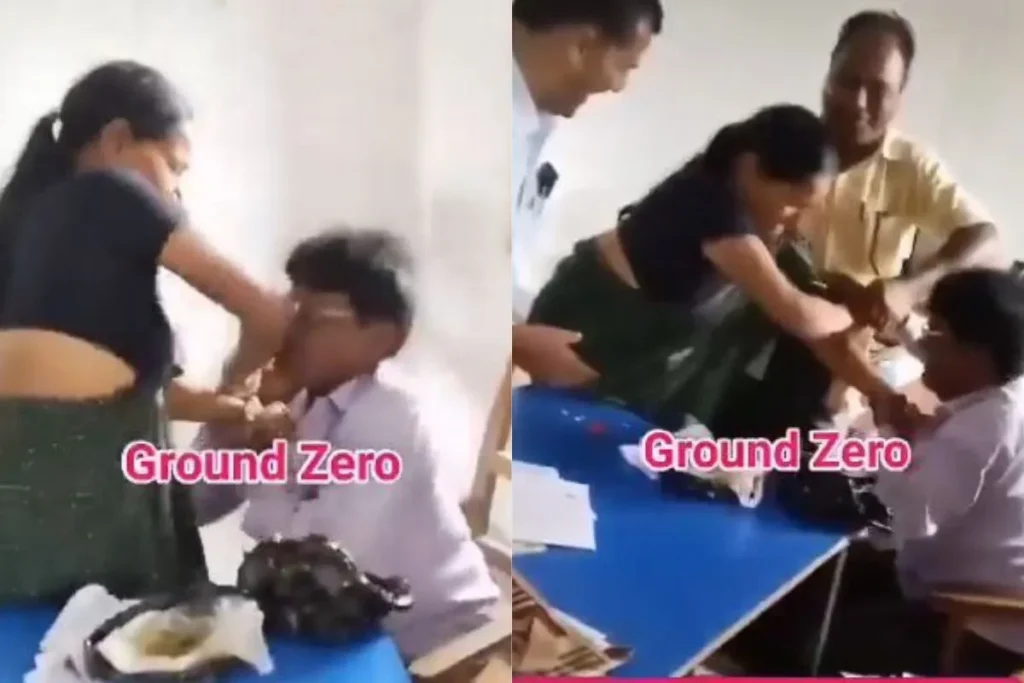 इस मारपीट के Viral Video को एक्स अकाउंट पर अपलोड किया गया है। वीडियो में देखा जा सकता है कि, महिला शिक्षिका ने आदमी का कॉलर पकड़ा हुआ है और आदमी ने महिला के हाथ को पकड़ा हुआ है। इस दौरान महिला अपने हाथ को छुड़ाने की कोशिश कर रही है। महिला के साथ अन्य दो आदमी भी दिख रहे हैं। ये अध्यापक इन्हें देखकर हंस रहे हैं। इस दौरान थोड़ी बहुत कोशिश ये इन्हें अलग करने की भी करते हैं लेकिन, महिला और पुरुष आपस में लड़ते ही रहते हैं। वीडियो में ये भी देखा जा सकता है कि, महिला अपना हाथ छुड़ाने के लिए टीचर के लात भी मार रही है।