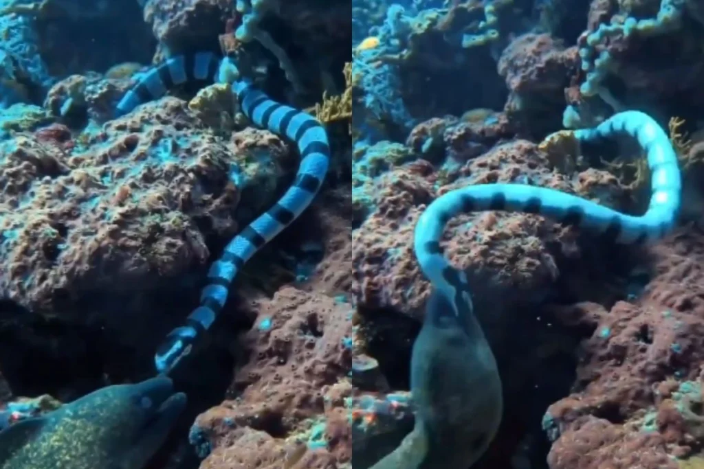 इस Viral Video को पानी के अंदर से रिकॉर्ड किया गया है। इसमें देखा जा सकता है कि, एक बड़ा सा ब्लू-लिप्ड सी क्रेट सांप मछली को निवाला बनाने के लिए आगे बढ़ रहा तो होता है।