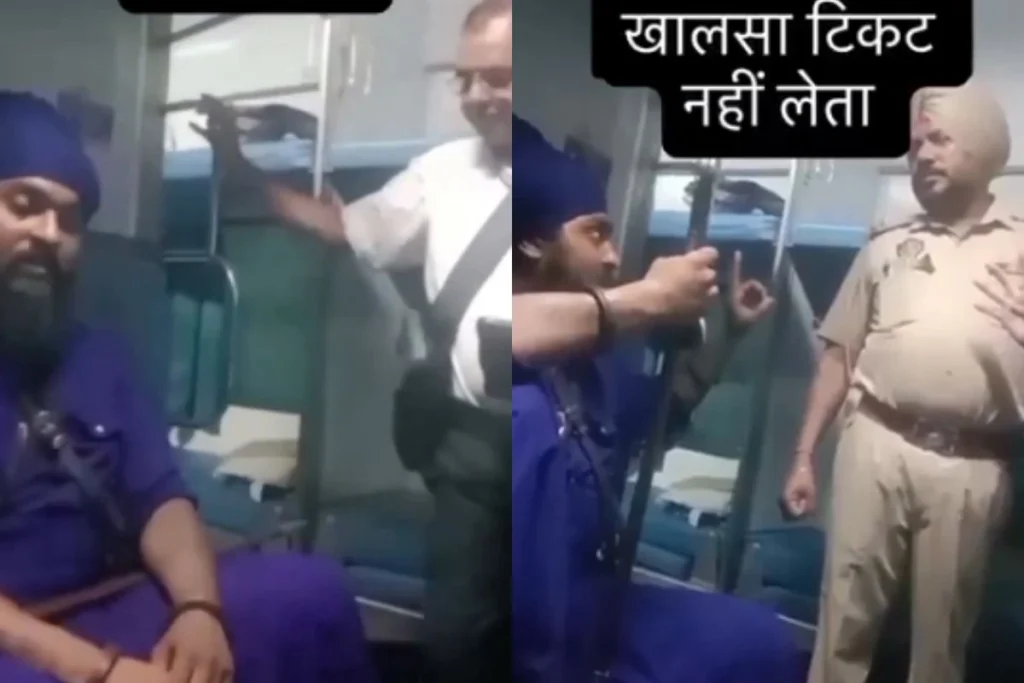 इसके साथ ही कुछ तर्क भी देना शुरु कर देता है। वीडियो में दिख रहा यात्री निहंग सिख बताया जा रहा है। बिना टिकट ट्रेन में बैठा यात्री जिस तरह से टीटीई और पुलिसकर्मी को तर्क दे रहा है वो किसी के भी गले नहीं उतर रहा है। वीडियो में टीटीई बिना टिकट एसी कोच में बैठे यात्री से बहस में हार जाता है। इसके बाद वो पुलिसवाले को बुला लेता है। यात्री और पुलिसकर्मी के बीच काफी बहस देखने को मिल रही है।