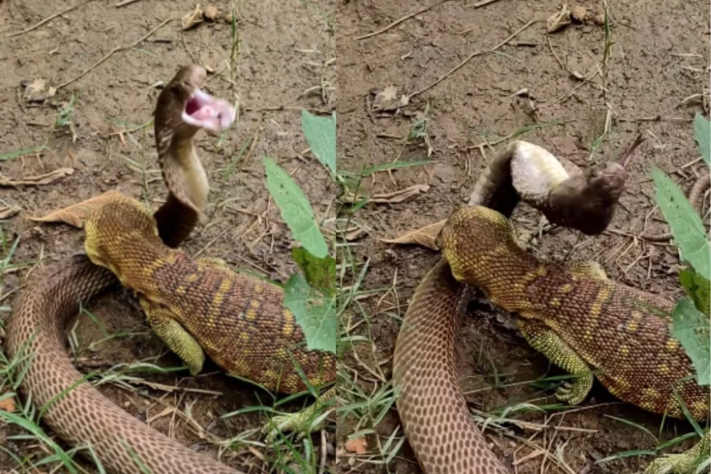 इसमें देखा जा सकता है कि, एक मॉनिटर लिजर्ड ने कोबरा सांप को पकड़ा हुआ है। वो उसकी गर्दन पर जैसे ही हमला करती है, सांप की चीखें निकलने लगती हैं। इस दौरान वो खुद को बचाने की काफी कोशिश करता है। लेकिन छिपकली के सामने वो बेबस हो चुका है। छोटी सी छिपकली इस जहरीले शिकारी पर भारी पड़ रही है।