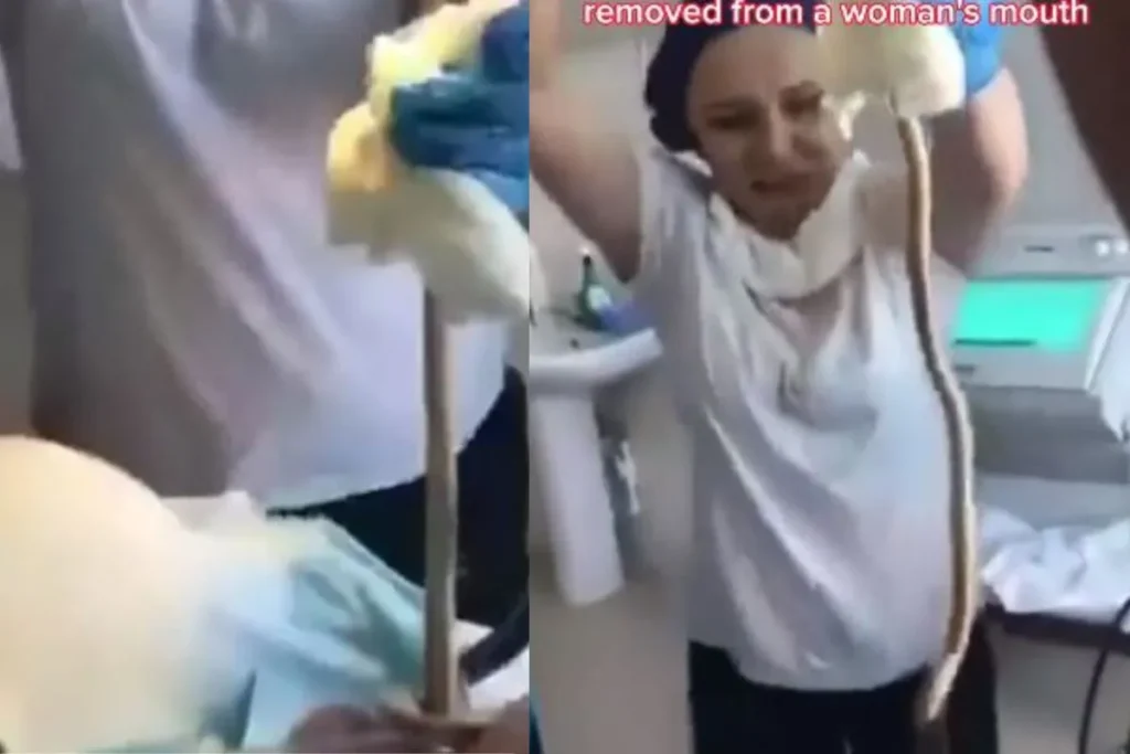इस Viral Video में देखा जा सकता है कि, किस तरह से महिला डॉक्टर पीड़ित महिला के मुंह से खींचकर इसे बार निकाल रही है। जो कि, दिखने में सांप जैसा लग रहा है। लेकिन ये सांप नहीं है। दरअसल ये टेपवर्म है। ये एक परजीवी होता है। जो आंतों में जीवित रह सकता है और खाना भी खा सकता है। ये अधिकरत कच्चा बीफ या फिर सुअर का मीट खाने वालों के पेट में होते हैं। इन्हें टेपवर्म संक्रमण के नाम से भी जाना जाता है। टेपवर्म हो जाने से पेट में दर्द डायरिया, गैस कमजोरी और तेजी से वजन कम होने लगता है। इस वायरल वीडियो में ये महिला इसी से पीड़ित है।