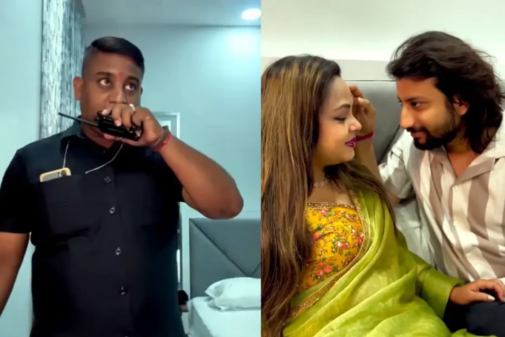 तंज से भरे इस वायरल वीडियो में कथित सुरक्षाकर्मी नए-नवेले कपल को हनीमून पर सुरक्षा दे रहे हैं। वायरल वीडियो में कपल को होटल के कमरे में एंट्री करते देखा जा सकता है। उससे पहले सर्विस एजेंसी के लोग कमरे का चप्पा-चप्पा छान मारते नजर आ रहे हैं। इसके माध्यम से सुरक्षा को प्राथमिकता दी जा रही है। फिर जैसे ही कपल अंदर एंट्री करता है कि एक कथित सुरक्षाकर्मी कपल को दरवाजा खोलकर रखने की सलाह देता है। फिर दूध का स्वाद भी पहले खुद ही लेता है और कपल से लाइट ना बंद करने की बात कहता है। Viral Video में ये सब कुछ होते देखा जा सकता है। फिर गुस्साई महिला होटल मालिक के पास पहुंचती है और इसकी शिकायत दर्ज कराती है। इसके बाद Viral Video की पोल खुलती है।
