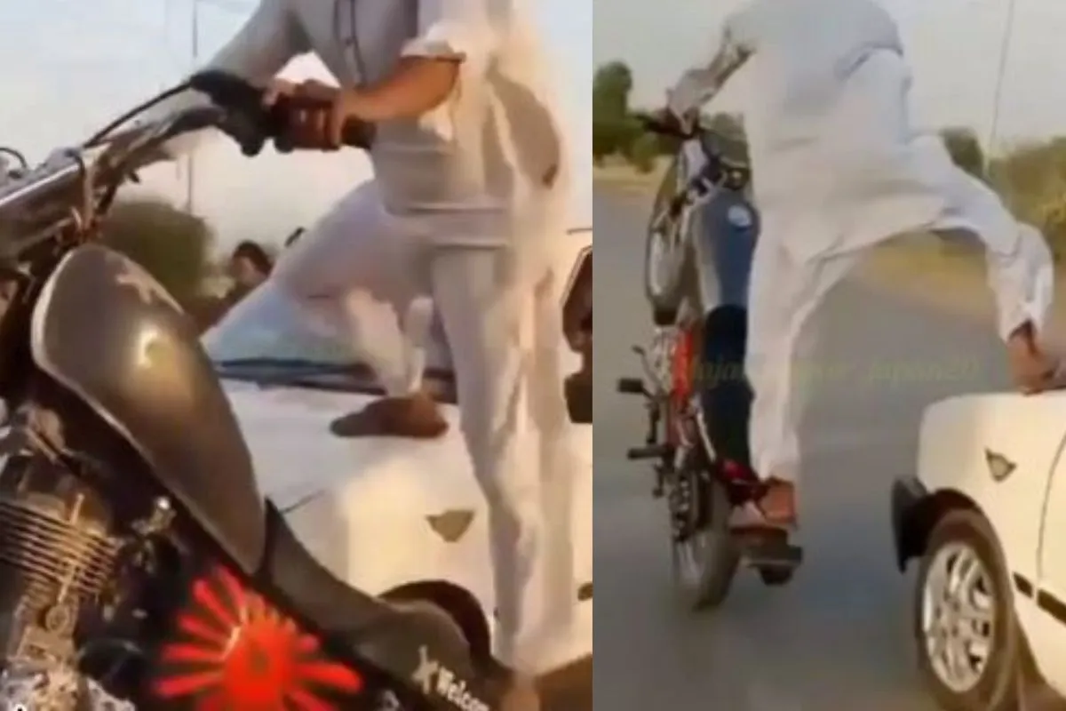 इस चशनबाज लड़के के वीडियो को majale_motor_japan20 नाम के इंस्टाग्राम अकाउंट से शेर किया गया है। इस वीडियो में देखा जा सकता है कि, लड़का बाइक चलाते हुए चलती हुई कार पर पैर रखकर स्टंट करने की कोशिश कर रहा है। इस दौरान उसके आस-पास कई सारे लोग नजर आ रहे हैं। जिन्हें देखकर लग रहा है कि, वो शायद किसी ग्रुप का हिस्सा है और खाली सड़क पर स्टंट कर रहा है। इस बीच इसे कोई अपने कैमरे से रिकॉर्ड भी कर रहा है। अचानक से लड़का बैलेंस खो बैठता है और धड़ाम से जमीन पर गिर जाता है। गिरने के बाद उसे काफी चोट भी लग जाती है। थोड़ी ही देर में उसकी सारी टशनबाजी निकल आती है।