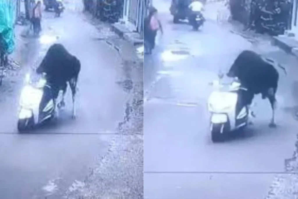 सांड ने दौड़ाई स्कूटी