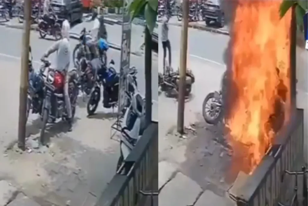 सोशल मीडिया प्लेटफॉर्म एक्स यानी ट्विटर पर ‘Ghar Ke Kalesh’ नाम से एक वीडियो शेयर की गई है। इंटरनेट पर यह वीडियो तेजी से वायरल वीडियो में तब्दील हो गई। वीडियो में नजर आता है कि बुलेट बाइक खड़ी हुई थी, एक आदमी मोटरसाइकिल पर आकर बैठता है और बाइक स्टार्ट करता है। इसके बाद मोटरसाइकिल में आग लग जाती है और धीरे-धीरे आग का ताडंव इतना बढ़ जाता है कि आसपास खड़े हुए दोपहिया वाहन भी लपेटे में आ जाते हैं और बुरी तरह से जल जाते हैं। हालांकि, बाइक स्टार्ट करने वाला सही समय पर कूदकर अपनी जान बचा लेता है।