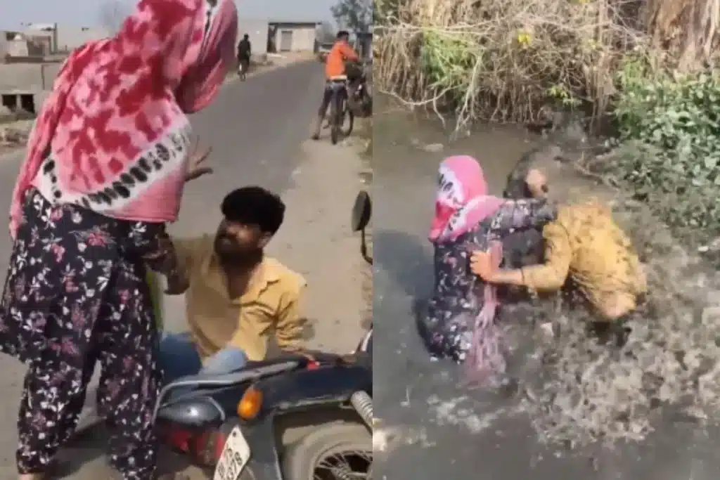 इस Viral Video में आप देख सकते हैं कि एक शख्स अपने मोटरसाइकिल को खींचते हुए जा रहा होता है। तभी पीछे से उसकी पत्नी आती है और उसे एक लात मार देती है। ऐसे में पति आव देखा है ना ताव जब उसकी मोटरसाइकिल गिर जाती है और फिर वह अपनी पत्नी को धक्का देता है। ऐसे में पति और पत्नी दोनों नाले में जाकर गिर जाते हैं। इतना होने के बावजूद दोनों की लड़ाई बंद नहीं होती है और वे एक दूसरे पर लात और घूसों की बारिश करने लगते हैं। चौंकाने वाली बात यह रही कि दोनों नाले में गिरे होते हैं लेकिन उन्हें कोई सुध नहीं होती है कि वे कीचड़ से सने है।