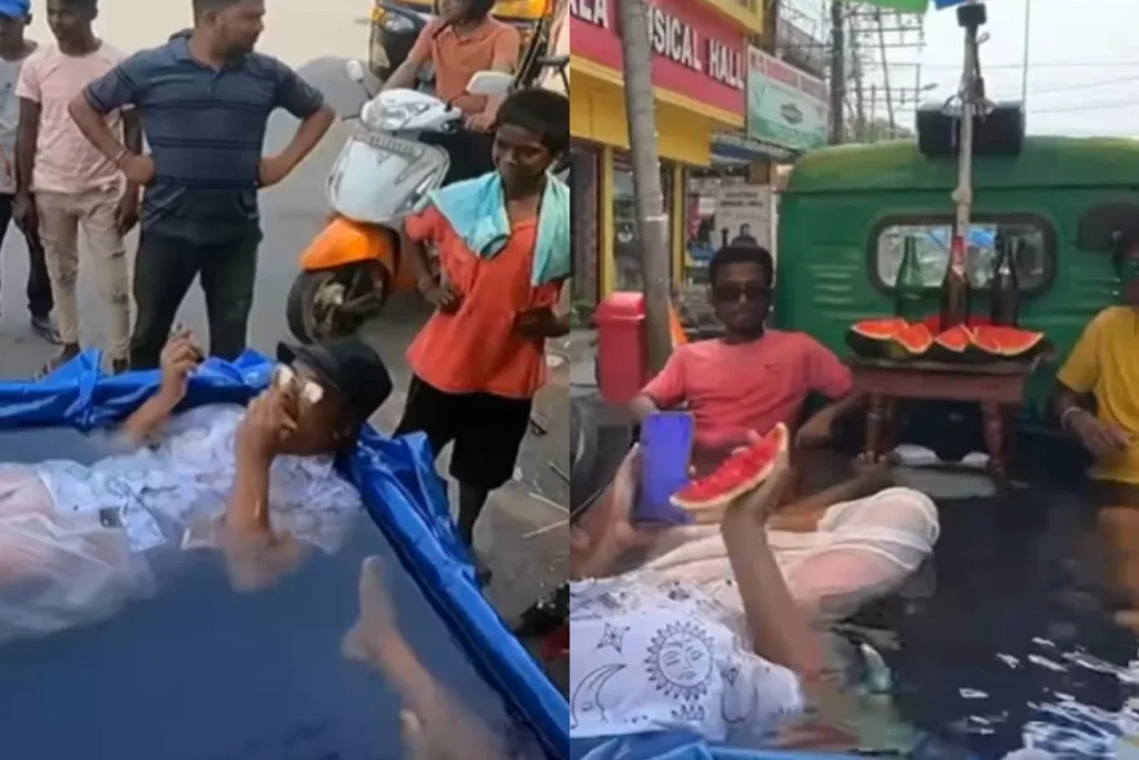 वायरल वीडियो की बात करें तो इसमें आप देख सकते हैं कि कुछ शख्स मिनी ऑटो को स्विमिंग पूल बनाकर उसमें एंजॉय करते हुए नजर आए हैं। दरअसल मिनी ऑटो के पीछे उन्होंने ब्लू प्लास्टिक के ऊपर पानी को भर दिया है जिसमें कुछ लोग लटकर इंजॉय कर रहे हैं। न सिर्फ स्विमिंग पूल बल्कि उनका ड्रेसिंग सेंस भी काफी कूल है और वे इस दौरान जमकर मजे ले रहे हैं। गॉगल्स के साथ स्टाइलिश पोज़ और उनका यह अंदाज हर कोई देखते रह गया।